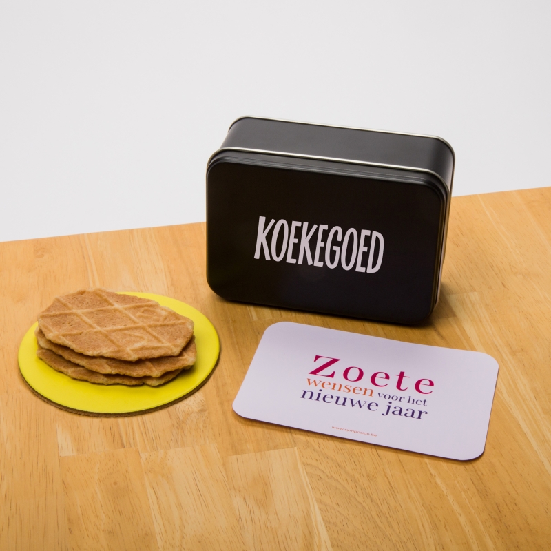 We maakten er een blikken koekendoosje van met de tekst 'Koekegoed'.