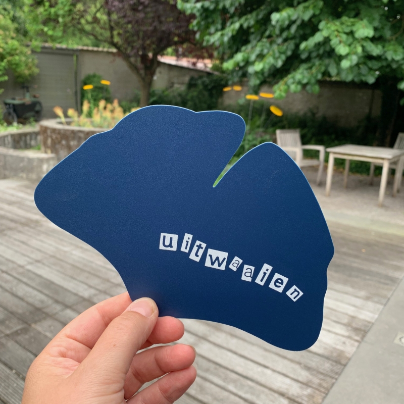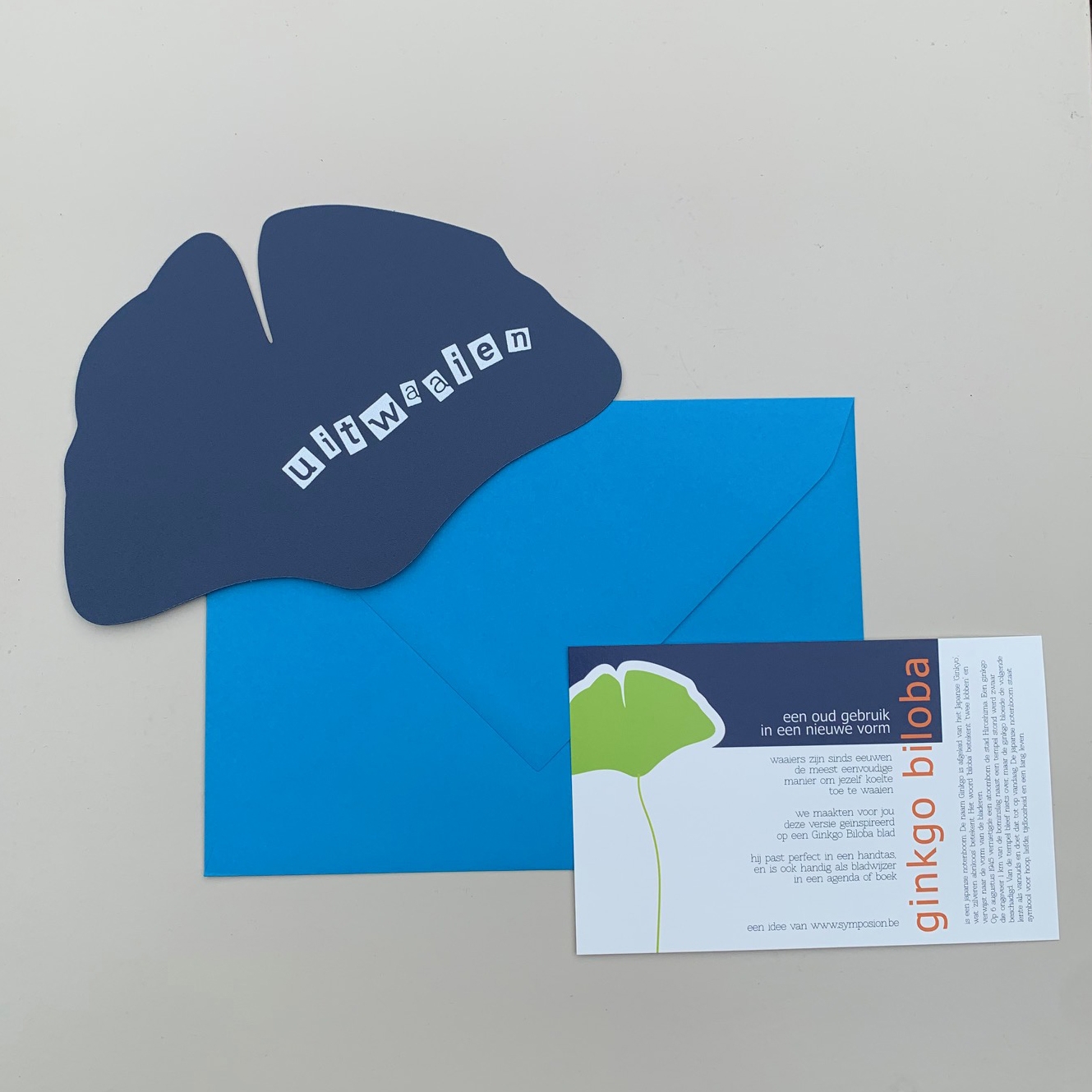 We maakten een kleine waaier die handig in agenda’s en handtassen past. De vorm van de waaier is geïnspireerd op een Ginkgo Biloba blad.